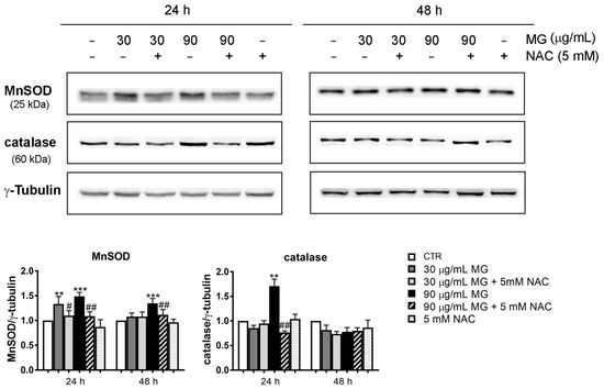 Furthermore, we verified whether these effects were accompanied with the upregulation of stress-associated proteins at 24 h and 48 h. As it can be observed in Figure 3, the manganese superoxide dismutase (MnSOD) and catalase levels, which are two radical scavenger enzymes, increased at 24 h with the two doses of MG. Such an effect was counteracted by the pre-incubation of cells in the presence of NAC (Figure 3). No changes in the levels of these proteins were found at 48 h of treatment.