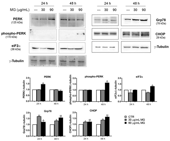 MG exposure activated the ER-stress-associated protein levels. HCT116 cells were treated in the presence of 30 and 90 μg/mL MG for 24 h and 48 h. Western blot analysis was performed to evaluate the protein expression of the ER stress markers PERK, phospho-PERK, eiF2α, Grp78 and CHOP. The amount of analyzed proteins was assessed using γ-tubulin as the loading control protein and for band density normalization. The data are presented as the mean ± SD; (*) p < 0.05 and (**) p < 0.01 compared with the untreated sample.
