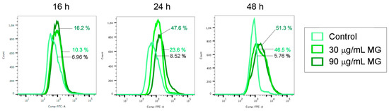 MG exposure increased the intracellular calcium level. Changes in the content of intracellular calcium analyzed at the indicated times via flow cytometry using Fluo 3-AM fluorochrome as reported in the Materials and Methods section.