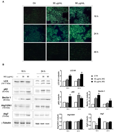 The induction of autophagy was also sustained by the conversion of microtubule-associated protein 1A/1B-light chain 3 known as LC3-I to LC-3II, which is the phosphatidylethanolamine conjugated form that is recruited to autophagosomal membranes [50,51] and represents a crucial marker of the autophagic flux. An increasing trend of some autophagy-associated factors, such as p62, Beclin 1 and Atg7, was also observed in MG-treated conditions, while no changes were noticed for Atg1/Ulk1 (Figure 6B).