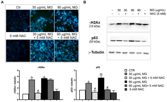 When exploring possible changes in DNA damage markers, we provided evidence that the phytochemical produced a consistent increase in γH2AX, as well as p53 (Figure 7B). Meanwhile, the pre-incubation with NAC counteracted MG effects on both chromatin condensation and γH2AX and p53 activation.