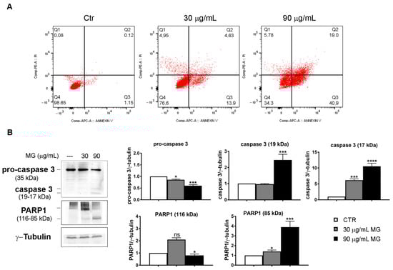 To elucidate the type of cell death induced by MG, we performed flow cytometry analyses using Annexin V/PI double staining (Figure 8A). At 48 h, about 19% of early (Q3 quadrant) and late (Q2 quadrant) apoptotic cells were found using 30 μg/mL of the compound. Such a value amounted to 60% apoptotic cells when the higher dose of MG was employed. We then checked the status of specific apoptotic markers, such as caspase-3 and its target PARP1. Specifically, we found that MG promoted a decrease in the pro-enzymatic form of caspase-3 and the appearance of the fragmented and activated forms at 19 and 17 kDa, respectively. Such an effect was accompanied with the fragmentation of PARP1, which is a caspase-3 target (Figure 8B).