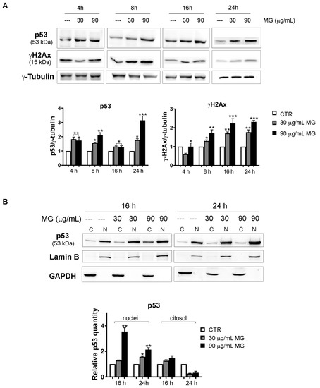 In light of these results, we wondered about the possible role of p53 and γH2AX in the mechanism analyzed. Time course studies (4–24 h) provided evidence that both doses of MG promoted an early upregulation of these factors, which were already visible after 4 h of incubation with the compound (Figure 9A). As it is known, p53 protein is activated in key responses to genotoxic stresses and DNA damage. In these scenarios, p53 translocates to the nucleus, boosting a tumor suppressor program via the cell cycle arrest or apoptosis via the direct transcriptional activation of specific pro-apoptotic targets, such as Apaf-1, Puma, Bax and Noxa [52,53]. By performing subcellular fractionation experiments, we found p53 accumulation in the nuclear fraction already at 16 h of incubation with MG (Figure 9B).