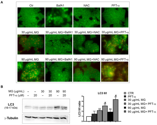 By using acridine orange (AO) staining, which corroborated the accumulation of acidic vesicular organelles (AVO, orange fluorescence) in the cytoplasm of MG-treated conditions, we observed that the addition of antioxidant NAC counteracted the autophagy, while Bafylomicin A1, which is an inhibitor of autophagosome-lysosome fusion, markedly inhibited the autophagic process (Figure 10A). On the other hand, pre-incubating the cells with pifithrin-α (PFT-α), which is a specific inhibitor of p53 transcriptional activity, the AVO accumulation induced by MG further increased (Figure 10A). Such an effect was also accompanied by an upregulation of the LC3-II form (Figure 10B), thus suggesting that p53 can negatively affect autophagy in response to MG.