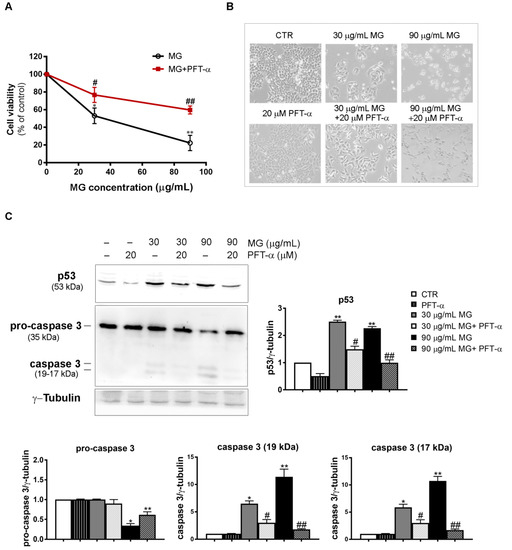 Accordingly, when we pre-incubated HCT116 cells for 2 h in the presence of PFT-α, followed by a co-treatment with MG for 48 h, PTF-α played a protective role against the cytotoxicity showed by the phytocompound alone. As shown in Figure 11A, the residual viability that amounted to only 22% with 90 μg/mL MG rose to about 60% when PFT-α was added.