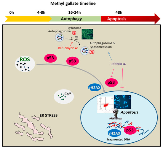 Timeline of the antitumor signaling pathway activated by MG in colon cancer cells. MG exposure triggered autophagy and apoptotic cell demise. The represented processes are orchestrated by an intertwined liaison between oxidative injury and p53. The early generation of ROS, accompanied with intracellular calcium increase and ER stress, stimulated p53 to switch the autophagy toward apoptotic cell death.