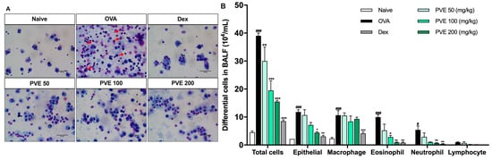 3.4. PVE Reduced the Recruitment of Inflammatory Cells in BALF of the OVA-Induced Asthmatic Mouse Model