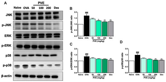 3.9. PVE Inactivates the MAPK Signaling Pathway in the OVA-Induced Asthmatic Mouse Model