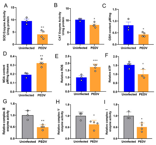 Oxidative stress was observed after being infected by PEDV. (A,B) The activities of anti–oxidant enzymes SOD and CAT were analyzed and normalized to tissue weight. (C,D) The contents of GSH and MDA were analyzed and normalized to tissue weight. (E) The relative ROS in the PEDV–infected piglets were analyzed. (F–I) The relative parameters of mitochondria ATP, enzyme complex–I, complex–III, and complex–V were analyzed. (*) p < 0.05, (**) p < 0.01 and (***) p < 0.001 compared with the uninfected sample. The circles represent distribution of results for different samples.
