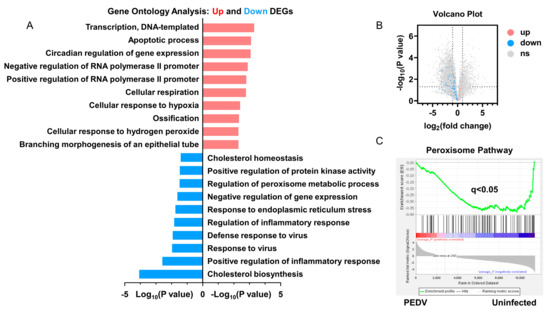 The transcriptional profiling showed that the anti–oxidative pathway was modulated by PEDV infection. (A) Gene ontology (GO) analysis showed that the anti–oxidative metabolic process is one of the most enriched pathways. (B) Volcano plot for the hepatic transcriptome of anti–oxidation measured by RNA–seq analysis. (C) The GSEA plot of the differentially expressed genes in the anti–oxidative pathway of the two groups. FDR, false–discovery rate.