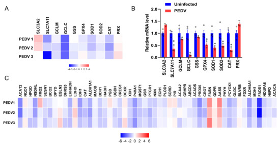 The expressions of genes included in anti–oxidation and fatty acid oxidation are inhibited by PEDV. (A) Heatmap of mRNA expression changes of the anti–oxidant metabolism genes from the data of RNA–seq. (B) The qRT–PCR analysis confirmed the mRNA expression changes of the anti–oxidant metabolism genes after being infected by PEDV. (C) Heatmap of mRNA expression changes of the fatty acid oxidation genes from the data of RNA–seq. (*) p < 0.05 compared with the uninfected sample. The circles represent distribution of results for different samples.
