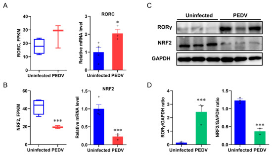 The expressions of RORγ and NRF2 in livers were dysregulated after being infected by PEDV. (A,B) Fragments Per Kilobase of transcript per Million mapped reads of RORC (encoding RORγ) and NRF2 were measured by RNA–seq and the mRNA expressions were measured by qRT–PCR. (C,D) The expression of RORγ and NRF2 at the protein level was evaluated via Western blotting. The intensity of these two proteins was normalized to GAPDH protein contents. (*) p < 0.05 and (***) p < 0.001 compared with the uninfected sample. The circles represent distribution of results for different samples.