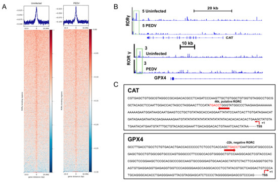 RORγ binding occupancies were reduced in the PEDV piglets. (A) ChIP–seq profiles (top) and heatmaps of ChIP–seq signal intensity (bottom) of RORγ within ±10 kb windows around the center of peak regions. (B) ChIP–seq signal visualization of RORγ at representative anti–oxidant metabolism genes CAT and GPX4, the numbers coupled with the group names of Uninfected or PEDV represent the maximum range of data. (C) Schematic diagram depicting the putative RORE sequence on the enhancers of CAT and GPX4.