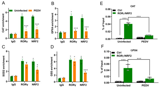 PEDV infection decreased the enrichment of RORγ and NRF2 at target loci of CAT and GPX4 genes and their physical interaction. (A–D) ChIP–qPCR analyses of RORγ and NRF2 occupancies at the locus of CAT, GPX4, SOD2, and GSS, normalized to IgG. (E,F) ChIP–re–ChIP analysis of the combined binding of RORγ and NRF2 at the locus of CAT and GPX4. (*) p < 0.05 and (***) p < 0.001 compared with the uninfected sample. The circles represent distribution of results for different samples.