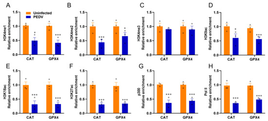 PEDV infection modifies histone modification at the locus of CAT and GPX4. (A–F) The relative enrichment of histone marks’ (H3K4me1/2/3, H3K9ac, H3K18ac, H3K27ac) occupancy was analyzed by ChIP–qPCR. (G,H) The relative enrichment of co–activator p300 and RNA polymerase II at the locus of CAT and GPX4. (*) p < 0.05 and (***) p < 0.001 compared with the uninfected sample. The circles represent distribution of results for different samples.