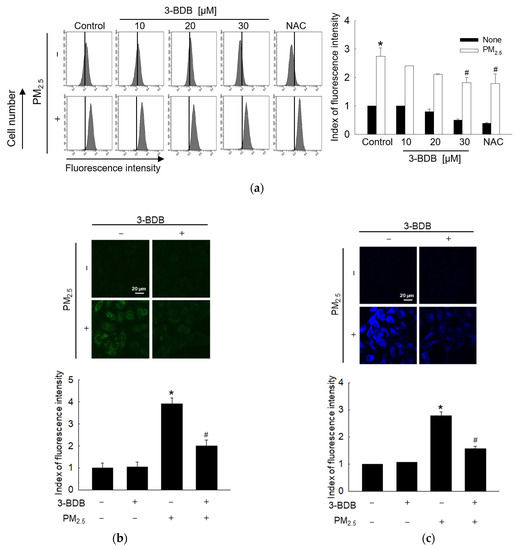 Inhibition of PM2.5-induced ROS generation and lipid peroxidation were performed by 3-BDB in keratinocytes. (a) Cells were added to 10, 20, and 30 μΜ of 3-BDB or 1 mM of N-acetyl cysteine (NAC) for 1 h and then exposed to 50 μg/mL of PM2.5 for 30 min. ROS were measured by a flow cytometer after H2DCFDA staining. (b) Depletion of PM2.5-induced ROS by 30 μM of 3-BDB was visualized by a confocal microscope after H2DCFDA staining. (c) Prevention of PM2.5-induced lipid peroxidation analysis by 3-BDB was performed using a confocal microscope after DPPP staining. (a–c) * p < 0.05 and # p < 0.05 compared to control cells and PM2.5-exposed cells, respectively.