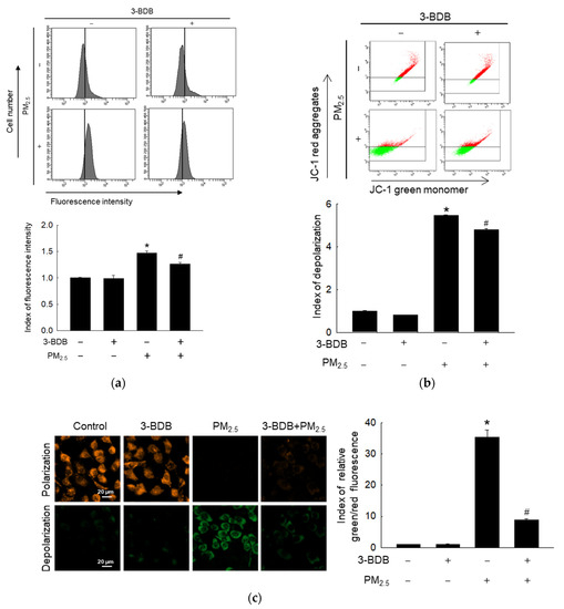 Prevention of PM2.5-induced mitochondrial dysfunction was performed by 3-BDB in keratinocytes. Cells were treated with 30 μΜ of 3-BDB for 1 h and then exposed to 50 μg/mL of PM2.5 for 24 h. (a) Rhod-2 AM was used to detect the mitochondrial calcium. (b,c) The mitochondrial membrane potential was obtained by (b) flow cytometry and (c) confocal microscopy by JC-1 staining. (a–c) * p < 0.05 and # p < 0.05 compared to control cells and PM2.5-exposed cells, respectively.