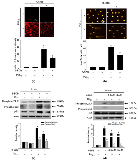 Reversibility of PM2.5-induced DNA damage and cell cycle arrest was performed by 3-BDB. Cells were treated with 30 μΜ of 3-BDB for 1 h and then exposed to 50 μg/mL of PM2.5 for 24 h. (a) Avidin-TRITC conjugate was used to detect the 8-oxoG. (b) A Comet assay was performed to analyze DNA damage. (c,d) The proteins were obtained from both (c) cells and (d) tissues, and phospho-H2A.X, phospho-p53, and p53 were examined by Western blot. (e) The checkpoint of the G1 phase was measured by flow cytometry. (a–e) * p < 0.05 and # p < 0.05 compared to control groups and PM2.5-exposed groups, respectively.
