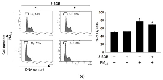 Cells treated with 3-BDB and PM2.5 possessed a lower level of 8-oxoG than those in the PM2.5-treated group. This implies that 3-BDB inhibited PM2.5-induced DNA oxidation (Figure 3a). Similar results confirmed that 3-BDB protected PM2.5-induced DNA damage in the comet assay because 3-BDB reduced the DNA tail length induced by PM2.5 in cells (Figure 3b). In addition, we detected phospho-H2A.X histone, a known indicator of DNA double-strand break [30], and a significant increase in phosphorylation of H2A.X in the PM2.5 group in vitro and in vivo was observed; however, in the 3-BDB and PM2.5 treatment group, a significant decrease in phospho-H2A.X was observed (Figure 3c,d). ROS and ROS-induced DNA damage activate p53, a known tumor suppressor [31]. There was an increase in the phosphorylation of p53 in the PM2.5 group; however, after treatment with 3-BDB, the level of activated p53 was lower in vitro and in vivo (Figure 3c,d). Furthermore, p53 controls the fate of cells when subjected to DNA damage, probably by arresting cell cycle progression [32,33]. Notably, the cell cycle analysis revealed that PM2.5 arrested the cell cycle at the G1 phase; however, 3-BDB attenuated it (Figure 3e).