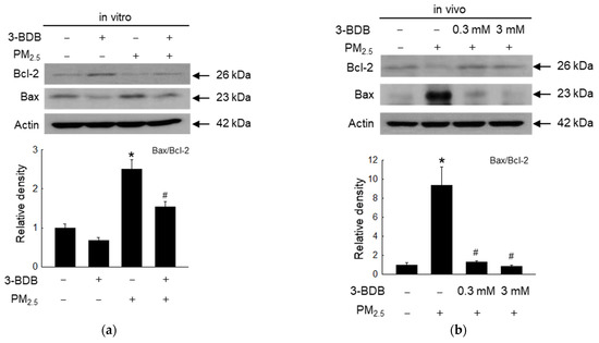 PM2.5 decreased the anti-apoptotic protein, Bcl-2, and increased the pro-apoptotic protein, Bax; however, 3-BDB reversed these effects in vitro and in vivo (Figure 4a,b). 3-BDB also reversed PM2.5-activated caspase-9 and caspase-3, the main markers of apoptosis-mediated cell death, in vitro and in vivo (Figure 4c,d). Nuclei integrity was visualized through Hoechst 33342 staining. Notably, PM2.5 increased apoptotic bodies, but 3-BDB significantly decreased the number of apoptotic bodies (Figure 4e).
