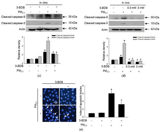 Reduction in PM2.5-induced cell apoptosis was by 3-BDB in vitro and in vivo. Cells were treated with 30 μΜ of 3-BDB for 1 h and then exposed to 50 μg/mL of PM2.5 for 24 h. Mice skin was treated with 3-BDB and PM2.5 according to the animal experiment in Materials and Methods. (a–d) The proteins were isolated from (a,c) cells, (b,d) tissue, and Bcl-2, Bax, and cleaved caspase-9, and cleaved caspase-3 were detected by Western blot. (e) The apoptotic bodies were counted by using Hoechst 33342 staining. The arrows indicate the apoptotic bodies. (a–e) * p < 0.05 and # p < 0.05 compared to control groups and PM2.5-exposed groups, respectively.