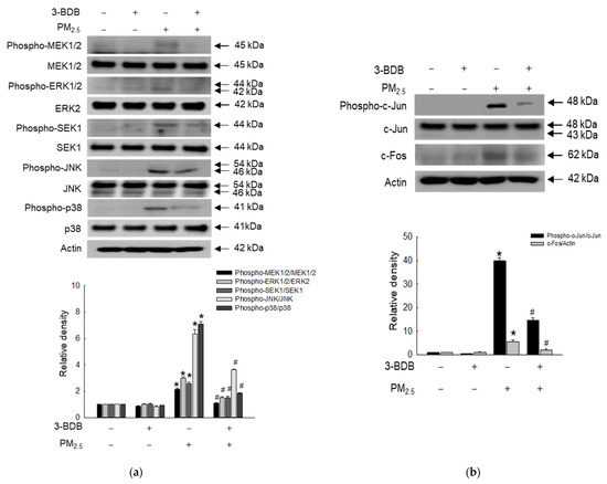 Inactivation of PM2.5-induced MAPK signaling pathway, the transcription factor AP-1 was performed by 3-BDB. (a,b) Cells were treated with 30 μΜ of 3-BDB for 1 h, and then the cells were stimulated by PM2.5 for 24 h, the proteins were separated from cells, and (a) phospho-MEK1/2, MEK1/2, phospho-ERK1/2, ERK2, phospho-SEK1, SEK1, phospho-JNK, JNK, phospho-p38, p38, as well as (b) c-Fos, phospho-c-Jun, and c-Jun expressions were detected by Western blot. (a,b) * p < 0.05 and # p < 0.05 compared to control cells and PM2.5-exposed cells, respectively.