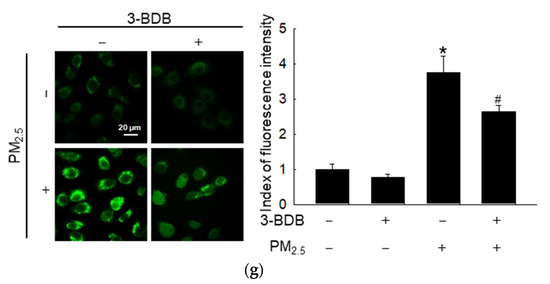 We detected the suppression of PM2.5-induced oxidation of lipids by 3-BDB using a diphenyl-1-pyrenylphosphine probe (DPPP, 2 µM; Molecular Probes). Cells were seeded into chamber slides, treated with 30 μΜ of 3-BDB for 1 h, and exposed to 50 μg/mL of PM2.5 for another 24 h. Lipid peroxidation fluorescence was detected using a confocal microscope after DPPP staining.