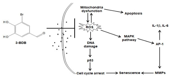 In summary, the inhibition of ROS generation by 3-BDB in human HaCaT keratinocytes and hairless mice reduces mitochondrial dysfunction and DNA damage response, which inhibits activation of the tumor suppressor p53 and cell cycle arrest. In addition, 3-BDB affects the inhibition of the MAPK signaling pathway and its regulated transcription factor, AP-1, reversing the formation of pro-inflammatory cytokines and MMPs, thereby inhibiting PM2.5-induced senescence by 3-BDB (Figure 7). Notably, 3-BDB had a protective effect against PM2.5-induced cellular damage and could be used as a preventive agent against air pollution-triggered skin damage.
