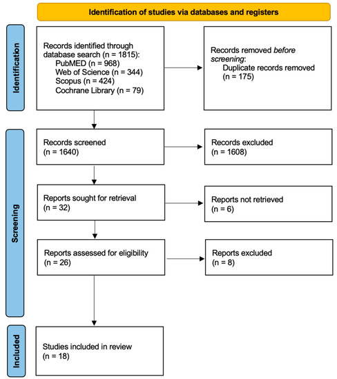 A search across four databases, namely Pubmed (968), Web of Science (344), Scopus (424), and Cochrane Library (79), yielded a total of 1815 publications. After the removal of duplicates (175), 1640 records were screened based on the title and abstract, leading to the exclusion of 1608 articles. From the remaining 32 records, 14 papers were excluded after full-text evaluation, either for being off-topic or failing to meet the inclusion criteria. Ultimately, a total of 18 publications were deemed eligible for qualitative analysis (Table 2). The selection process is outlined in Figure 2.