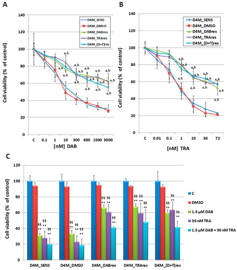 Viability (MTT assay) in D4M_SENS, D4M_DMSO, D4M_DABres, D4M_TRAres, and D4M_(D+T)res untreated or exposed to dabrafenib (DAB) (A), or trametinib (TRA) (B) at the indicated concentrations 72 h after the treatment. Results are expressed as a percent of respective untreated control (C) and are the mean ± SD of six separate experiments. a: p < 0.01 vs. D4M_SENS; b: p < 0.01 vs. D4M_DMSO. (C) Viability (MTT assay) in D4M_SENS, D4M_DMSO, D4M_DABres, D4M_TRAres, and D4M_(D+T)res untreated or exposed to DMSO (dilution 1/1000), 1.5 μM DAB, 36 nM TRA, and 1.5 μM DAB plus 36 nM TRA combined treatments for 72 h. Results are expressed as a percent of respective untreated control (C) and are the mean ± SD of six separate experiments. ** p < 0.01 vs. D4M_SENS; §§ p < 0.01 vs. D4M_DMSO.