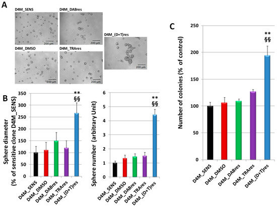 Anchorage-independent cell growth in untreated D4M_SENS, D4M_DMSO, D4M_DABres, D4M_TRAres, and D4M_(D+T)res. (A) Representative images of cell morphology obtained with a phase-contrast microscope in the sphere formation Assay. (B) Sphere diameter was expressed as the percent of spheres obtained in the sensitive clone D4M_SENS; sphere numbers greater than 50 μm were expressed as an arbitrary unit, normalized to the value obtained in the sensitive clone D4M_SENS. (C) Soft agar assay in untreated D4M_SENS, D4M_DMSO, D4M_DABres, D4M_TRAres, and D4M_(D+T)res. Colonies > 0.5 mm were counted using ImageJ software. Results were presented as the mean ± SD of triplicate samples from representative data of three independent experiments. ** p < 0.01 vs. D4M_SENS; §§ p < 0.01 vs. D4M_DMSO.
