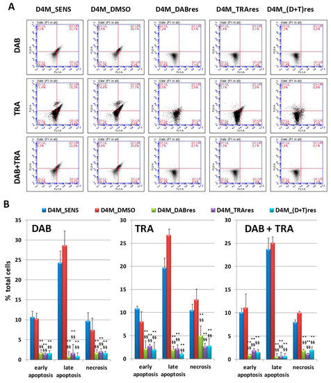 Apoptosis in D4M_SENS, D4M_DMSO, D4M_DABres, D4M_TRAres, and D4M_(D+T)res treated with 1.5 μM DAB, 36 nM TRA or combination (DAB + TRA). (A) The flow cytometry profiles of a representative experiment in Annexin V/IP-stained cells at 24 h are shown. Q1-LL = live (Annexin V−/PI−), Q1-LR = early stage of apoptosis (Annexin V+/PI−), Q1-UR = late stage of apoptosis (Annexin V+/PI+), and Q1-UL = necrosis (Annexin V−/PI+). (B) Histograms reporting cytofluorimetric analysis of Annexin V/PI staining in D4M treated sublines. Results of early and late apoptosis and necrosis were expressed as means ± SD of three independent experiments. ** p < 0.01 vs. D4M_SENS; §§ p < 0.01 vs. D4M_DMSO.