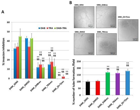 (A) Boyden chamber assay at 6 h in D4M_SENS, D4M_DMSO, D4M_DABres, D4M_TRAres, and D4M_(D+T)res sublines treated with 1.5 μM DAB, 36 nM TRA or combination (DAB + TRA). The results are expressed as a percentage of invasion inhibition, as the mean ± SD of five independent experiments. ** p < 0.01 vs. D4M_SENS; §§ p < 0.01 vs. D4M_DMSO. (B) Representative images of the tube formation assay on HUVECs after exposure to the conditioned media from untreated D4M_SENS, D4M_DMSO, D4M_DABres, D4M_TRAres, and D4M_(D+T)res subclones. Tube formation was photographed after 6 h incubation with these conditioned media and evaluated by counting the total number of tubes in three wells; three different experiments were performed. The results are illustrated in the histogram below. The data are the mean ± SD of three independent experiments ** p < 0.01 vs. D4M_SENS; §§ p < 0.01 vs. D4M_DMSO.