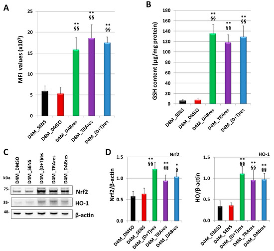 Nrf2 expression in D4M cell lines. (A) Intracellular oxidative stress levels in D4M_SENS, D4M_DMSO, D4M_DABres, D4M_TRAres, and D4M_(D+T)res untreated cells, measured by incubating cells with dichlorodihydrofluorescein diacetate (DCF-DA). The amount of fluorescent product (2,7-dichlorodihydrofluorescein, DCF) was measured by FACScan cytometer (Becton Dickinson Accuri). Bar graph showing median fluorescence intensity (MFI) values, expressed as means ± SD. ** p < 0.01 vs. D4M_SENS; §§ p < 0.01 vs. D4M_DMSO. (B) GSH level was evaluated in D4M_SENS, D4M_DMSO, D4M_DABres, D4M_TRAres, and D4M_(D+T)res untreated cells. Values are the mean ± SD of three separate evaluations. ** p < 0.01 vs. D4M_SENS; §§ p < 0.01 vs. D4M_DMSO. (C) Western blot analysis of Nrf2, and its target gene HO-1 in D4M_DMSO, D4M_SENS, D4M_(D+T)res, D4M_TRAres, and D4M_DABres untreated cells. (D) Densitometric analysis of the protein expression, normalized using the β-actin signal. Data are the mean ± SD of three independent experiments. * p < 0.05 and ** p < 0.01 vs. D4M_SENS; § p < 0.05 and §§ p < 0.01 vs. D4M_DMSO.
