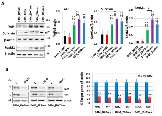 YAP expression and its regulation by Nrf2. (A) Western blot analysis of YAP and its target genes Survivin (the arrow is indicated the right band) and FoxM1 basal expression in D4M_DMSO, D4M_SENS, D4M_(D+T)res, D4M_TRAres, and D4M_DABres untreated cells. On the right densitometric analysis of the protein expressions, normalized using the β-actin signal. Data are the mean ± SD of three independent experiments. ** p < 0.01 vs. D4M_SENS; §§ p < 0.01 vs. D4M_DMSO; # p ≤ 0.05. (B) Western blot analysis of Nrf2 and YAP expressions in D4M-resistant cells in untreated control cells (C) or 24 h after the treatment with siRNA targeting Nfr2 (siNrf2). On the right is a densitometric analysis of protein expressions. Data were normalized using the β-actin signal and are indicated in the percentage of control values as the mean ± SD of three independent experiments. ** p ≤ 0.01 vs. C.