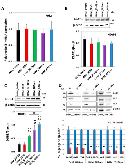 Nrf2 expression regulation. (A) Nrf2 mRNA expression in D4M_DMSO, D4M_SENS, D4M_(D+T)res, D4M_TRAres, and D4M_DABres untreated cells. mRNA expression was evaluated by qRT-PCR in triplicate. Abelson (Abl) gene was utilized as a housekeeping control. Results showing a discrepancy greater than one cycle threshold in one of the wells were excluded. The results were analyzed using the ΔΔCt method. (B) Western blot analysis of KEAP1 in D4M_DMSO, D4M_SENS, D4M_(D+T)res, D4M_TRAres, and D4M_DABres untreated cells. Below is a densitometric analysis of the protein expression, normalized using the β-actin signal. Data are the mean ± SD of three independent experiments. (C) Western blot analysis of DUB3 in D4M_DMSO, D4M_SENS, D4M_(D+T)res, D4M_TRAres, and D4M_DABres untreated cells. Below is a densitometric analysis of the protein expression, normalized using the β-actin signal. Data are the mean ± SD of three independent experiments. ** p < 0.01 vs. D4M_SENS; §§ p < 0.01 vs. D4M_DMSO. ## p < 0.01. (D) Western blot analysis of DUB3, Nrf2, and YAP expressions in D4M resistant cells in untreated control cells (C) or after 24 h from the treatment with siRNA targeting DUB3 (siDUB3). On the right is a densitometric analysis of protein expressions. Data were normalized using the β-actin signal and are indicated in the percentage of control values as the mean ± SD of three independent experiments. ** p ≤ 0.01 vs. C.