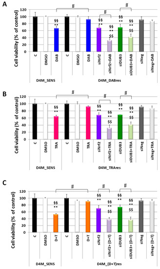 Viability (MTT assay) in D4M_SENS or resistant subclones treated with specific siRNAs targeting Nrf2 (siNrf2) or DUB3 (siDUB3). (A) Viability in untreated D4M_SENS (Control, C) or treated with DMSO or 1.5 μM DAB; viability in untreated D4M_DABres cells (Control, C) or treated with DMSO (DMSO), 1.5 μM DAB (DAB), siNrf2, siNrf2 plus 1.5 μM DAB (siNrf2+DAB), siDUB3, siDUB3 plus 1.5 μM DAB (siDUB3+DAB), siNeg, siNeg plus 1.5 μM DAB (siNeg+DAB). Results are expressed as a percent of control and are the mean ± SD of three separate experiments. ** p < 0.01 vs. respective Control untreated cells; §§ p < 0.01 vs. respective DMSO treated cells; $$ p < 0.01 vs. D4M_DABres or D4M_SENS cells treated with DAB; ∫∫ p < 0.01. (B) Viability in untreated D4M_SENS (Control, C) or treated with DMSO or 36 nM TRA; viability in untreated D4M_TRAres cells (Control, C) or treated with DMSO (DMSO), 36 nM TRA (TRA), siNrf2, siNrf2 plus 36 nM TRA (siNrf2+tra), siDUB3, siDUB3 plus 36 nM TRA (siDUB3+TRA), siNeg, siNeg plus 36 nM TRA (siNeg+TRA). Results are expressed as a percent of control and are the mean ± SD of three separate experiments. ** p < 0.01 vs. respective Control untreated cells; §§ p < 0.01 vs. respective DMSO treated cells; $$ p < 0.01 vs. D4M_TRAres or D4M_SENS cells treated with 36 nM TRA; ∫∫ p < 0.01. (C) Viability in untreated D4M_SENS (Control, C) or treated with DMSO or 1.5 μM DAB plus 36 nM TRA combined treatments (D+T); viability in untreated D4M_(D+T)res cells (Control, C) or treated with DMSO (DMSO), 1.5 μM DAB plus 36 nM TRA combined treatments (D+T), siNrf2, siNrf2 plus combined treatment (siNrf2+ (D+T), siDUB3, siDUB3 plus plus combined treatment (siNrf2+ (D+T), siNneg, siNeg plus combined treatment (siNrf2+ (D+T). Results are expressed as a percent of control and are the mean ± SD of three separate experiments. ** p < 0.01 vs. respective Control untreated cells; §§ p < 0.01 vs. respective DMSO treated cells; $$ p < 0.01 vs. D4M_(D+T)res cells or D4M_SENS cells treated with 1.5 μM DAB plus 36 nM TRA combined treatments (D+T); ∫∫ p < 0.01.