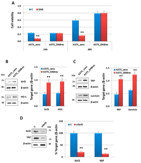 Analysis in A375_sens and A375_DABres human melanoma cell lines. (A) Viability (MTT assay) in A375_sens and A375_DABres untreated (control, C) or treated with dabrafenib 200 nM (DAB). Results are the mean ± SD of three separate experiments. ** p < 0.01 vs. A375_sens. (B) Western blot analysis of Nrf2 and its target gene HO-1 in A375_sens and A375_DABres untreated cells. On the right is a densitometric analysis of the protein expressions, normalized using the β-actin signal. Data are the mean ± SD of three independent experiments. ** p < 0.01 vs. A375_sens. (C) Western blot analysis of YAP and its target gene Survivin in A375_sens and A375_DABres untreated cells. On the right is a densitometric analysis of the protein expressions, normalized using the β-actin signal. Data are the mean ± SD of three independent experiments. ** p < 0.01 vs. A375_sens. (D) Western blot analysis of Nrf2 and YAP expressions in untreated A375_DABres untreated control cells (C) or after 24 h from the treatment with siRNA targeting Nfr2 (siNrf2). On the right is a densitometric analysis of protein expressions. Data were normalized using the β-actin signal and are indicated in the percentage of control values as the mean ± SD of three independent experiments. ** p ≤ 0.01 vs. C.