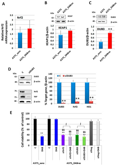 Nrf2 expression regulation in A375 cells. (A) Nrf2 mRNA expression in A375_sens and A375_DABres untreated cells. mRNA expression was evaluated by qRT-PCR in triplicate. Abelson (Abl) gene was utilized as a housekeeping control. Results showing a discrepancy greater than one cycle threshold in one of the wells were excluded. The results were analyzed using the ΔΔCt method. (B) Western blot analysis of KEAP1 in A375_sens and A375_DABres untreated cells. Below is a densitometric analysis of the protein expression, normalized using the β-actin signal. Data are the mean ± SD of three independent experiments. (C) Western blot analysis of DUB3 in A375_sens and A375_DABres untreated cells. Below is a densitometric analysis of the protein expression, normalized using the β-actin signal. Data are the mean ± SD of three independent experiments. ** p < 0.01 vs. A375_sens. (D) Western blot analysis of DUB3, Nrf2, and YAP expressions in A375_DABres untreated control cells (C) or after 24 h from the treatment with siRNA targeting DUB3 (siDUB3). On the right is a densitometric analysis of protein expressions. Data were normalized using the β-actin signal and are indicated in the percentage of control values as the mean ± SD of three independent experiments. ** p ≤ 0.01 vs. C. (E) Viability in untreated A375_sens (Control, C) or treated with 200 nM DAB; viability in A375_DABres cell untreated (control, C) or treated with siNrf2, siNrf2 plus 200 nM DAB, siDUB3, siDUB3 plus 200 nM DAB, siNneg, siNeg plus 200 nM DAB. Results are expressed as percent of control and are the mean ± SD of three separate experiments. ** p < 0.01 vs. respective Control untreated cells; §§ p < 0.01 vs. respective 200 nM DAB treated cells; ∫ p < 0.05.