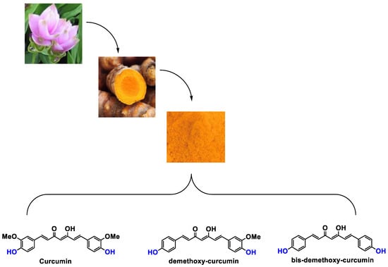 It is now well established [104] that curcumin extracts or curcumin powder contain three main compounds and several others in much smaller quantities. These three compounds are (1E,6E)-1,7-bis(4-hydroxy-3-methoxyphenyl)-1,6-heptadiene-3,5-dione, present in 60−70% of the crude extract, demethoxycurcumin in 20–30%, and bisdemethoxycurcumin in 10% (Table 3 and Figure 1). A number of studies have been carried out on curcumin as a replacement for anti-inflammatory drugs (NSAID), which can have undesirable side effects such as renal damage [105,106], in order to find alternatives for the treatment of rheumatoid arthritis [107] or other inflammatory diseases. Du et al. [108] produced a synthetic pharmacomodulation of curcumin and showed anti-inflammatory activity. A large number of studies have been carried out with sometimes contradictory results, and in 2017 a review was published on the inventory of research and doubts about the effectiveness of curcuminoids [109]. Despite this, researchers continue to study this widely used spice. Its main problem lies in its instability in biological media in vitro and in vivo, which has led to disappointing clinical trials to date [110]. However, at the therapeutic level, some researchers have also described low potency, poor pharmacodynamics, and toxic effects [109,111].