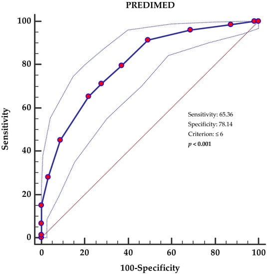Receiver operator characteristic (ROC) for NAFLD’s (FLI ≥ 60) predictive values of PREDIMED score. The 45° diagonal line serves as a reference line, as it is the ROC curve of the random classification. The line with the red dots represents the distribution of the data while the two dashed lines outside it represent the confidence intervals. The point furthest northwest of the ROC curve corresponds to the best cut-off, in the sense of maximizing the number of correctly classified subjects (and minimizing the number of subjects with a false diagnosis). A p-value in bold denotes a significant difference (p < 0.05). PREDIMED, PREvención con DIetaMEDiterránea.