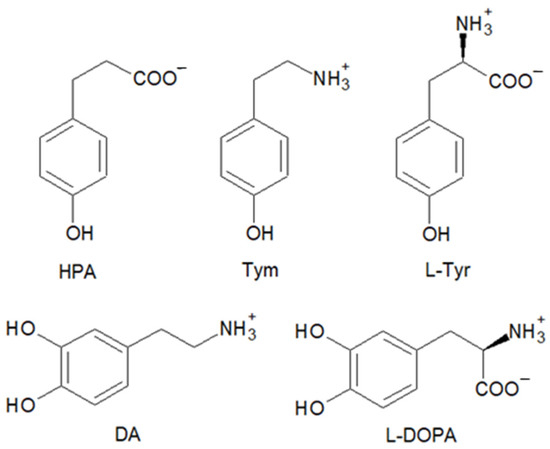 Structure of the substrates used in the kinetic and mass spectrometry studies: 3-(4-hydroxyphenyl)propanoic acid (HPA), tyramine (Tym), L-tyrosine (L-Tyr), dopamine (DA), and L-DOPA.