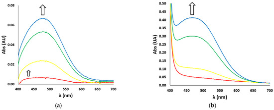 UV-Vis spectra vs. time (red line t = 0 s, yellow line t = 10 s, green line t = 60 s, blue line t = 120 s) of (a) nitration reaction with the H2O2/NO2− system (H2O2 500 mM and NO2− 500 mM) and (b) oxidation reaction (with H2O2 100 mM) of DA (3 mM), in the presence of Aβ16 1 μM and hemin 0.2 μM, in phosphate buffer 100 mM, pH 7.4 at 25 °C. The smaller (a) and bigger (a,b) arrows indicate the development over time of the absorption bands of the nitrated (422 nm) and oxidated (476 nm) products, respectively.