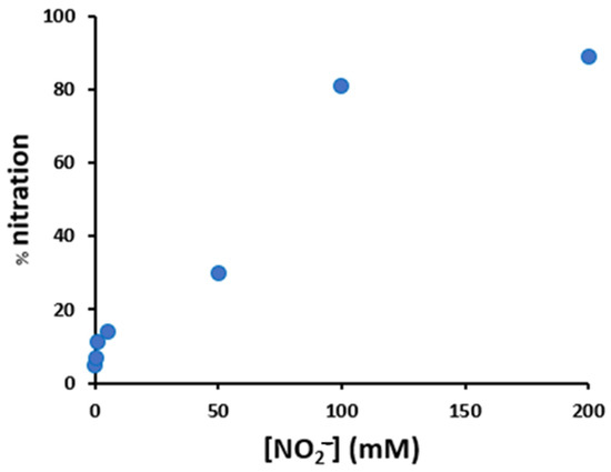 Finally, the possible nitration reaction occurring on hemin was explored, considering that horse heart myoglobin treated with H2O2/NO2− was reported to undergo hemin nitration by substitution of a proton from the porphyrin vinyl group with a NO2 group [40,48,55].
