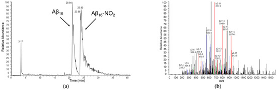 Mass spectrometry studies were performed to detect and quantify the modifications undergone by the peptide residues in the presence of the reactive species generated by the hemin/H2O2/NO2− system. In particular, it was reported that Aβ16 can undergo three types of modifications in the presence of ROS/RNS: oxidation due to the binding of an oxygen atom to a His residue, nitration due to the substitution of a hydrogen atom with a nitro group on a Tyr residue, and dimerization due to the formation of a radical on a Tyr residue, followed by a coupling step [48,49,50]. Moreover, in the presence of catechols such as DA or 4-methylcatechol, the corresponding quinones can react with Cys, His, or Lys residues, forming adducts with the peptide [42,51].
