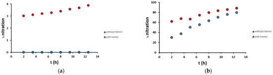 Percentage nitration of the Aβ16 peptide (10 μM) along time in (a) mild (200 μM H2O2/200 μM NO2−) and (b) harsh (20 mM H2O2/200 mM NO2−) conditions, in the presence (2 μM, red) and absence (blue) of hemin, in phosphate buffer 100 mM, pH 7.4 at 25 °C.