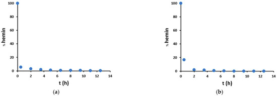 Therefore, hemin degradation promoted by H2O2/NO2− was studied in more detail (Figure 8). Hemin signal decreases with time, starting from 100% in a blank sample (without hydrogen peroxide) and leading after 30 min to almost complete hemin degradation, both in mild and harsh conditions. Therefore, we can deduce that the catalyzed nitration of tyrosine residue runs out very quickly, and this is also in agreement with the trends observed in Figure 7: in the presence of hemin (red dots), there is a big increase in nitration yield from 0 to 2 h, and after that, there is just a small variation, due to both the not-catalyzed reaction and the catalysis given by free iron and degraded hemin. Instead, in the absence of hemin (blue dots), an almost linear increase trend is observed.