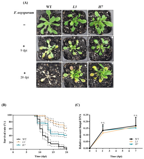 Arabidopsis survival after F. oxysporum infection and fungal burden. (A) Phenotype showed by WT, L3, and H7 Arabidopsis plants after 9 and 20 dpi infected (+) or not (−) with F. oxysporum. Scale bar = 1 cm. (B) Kaplan–Meier plot of the different genotypes showing Arabidopsis survival after infection with F. oxysporum over the course of 20 dpi. (C) Fungal burden at 0, 2, and 7 dpi determined by RT-qPCR analysis of the F. oxysporum actin gene relative to the Arabidopsis TUB4 gene. Data represent the mean ± SEM of at least three independent experiments. There were no significant differences in (C) between the genotypes at any of the time points according to the Tukey´s multiple comparison test (p < 0.05; n.s.).