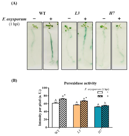 Peroxidase activity in Arabidopsis roots after F. oxysporum infection. (A) Representative images showing peroxidase activity in WT, L3, and H7 Arabidopsis seedling roots before (−) and after (+) F. oxysporum inoculation (1 hpi) and (B) image quantification. Data represent the mean ± SEM of at least three independent experiments (number of seedlings per experiment and genotype in (B) = 12). Different letters denote significant differences between the genotypes according to the Tukey´s multiple comparison test (p < 0.05; capital letters for control and lowercase for infected roots). Asterisks denote significant differences with respect to the control within each genotype according to the Dunnett´s multiple comparison test (p < 0.05).