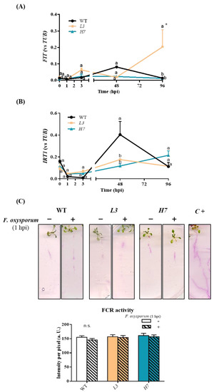 Effect of F. oxysporum on iron metabolism in Arabidopsis seedlings. RT-qPCR analysis of FIT (A) and IRT1 (B) expression levels in WT, L3, and H7 Arabidopsis seedlings after F. oxysporum inoculation (0–96 hpi). (C) Representative images showing ferric chelate reductase (FCR) activity of the different Arabidopsis seedling root genotypes before (−) and after (+) F. oxysporum inoculation (1 hpi), as well as image quantification. Data represent the mean ± SEM of at least three independent experiments (number of seedlings per experiment and genotype in (C) = 12). Time 0 hpi refers to the mean of the control values at the different time points. Different letters denote significant differences between the genotypes at each time point according to the Tukey´s multiple comparison test (p < 0.05). Asterisks denote significant differences with respect to control (0 hpi) according to the Dunnett´s multiple comparison test (p < 0.05).